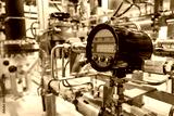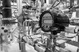 Pressure sensor in chemical plant. Electronic sensor near pipes of different diameters. Equipment for chemical production. Sensor measures pressure in factory pipes. Plant for production of chemicals
