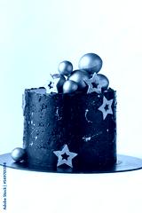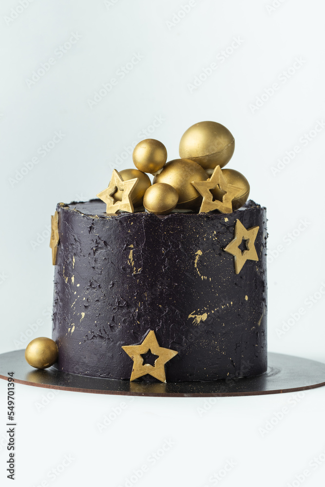 Luxury cake with dark blue cream cheese frosting decorated with golden chocolate stars and spheres. Birthday space themed cake on the white background