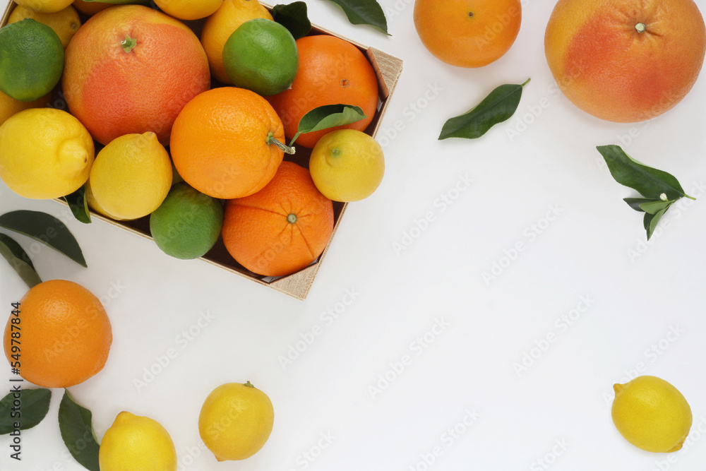 Citrus fruits frame or border on white background. Top view. Arranged oranges, lemons, grapefruits and limes with leaves, whole, scattered and in box. Copy space. Photo from above.