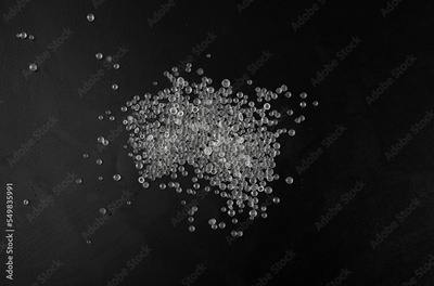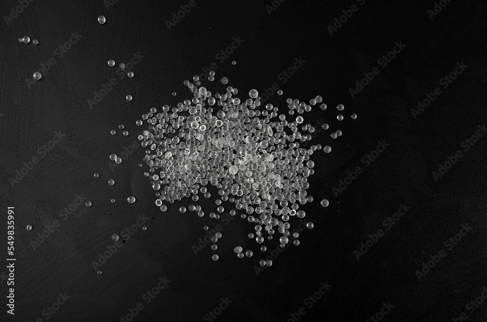 Desiccant Silica Gel Adsorbent Crystals on Black Background, Desiccant Polymer Balls
