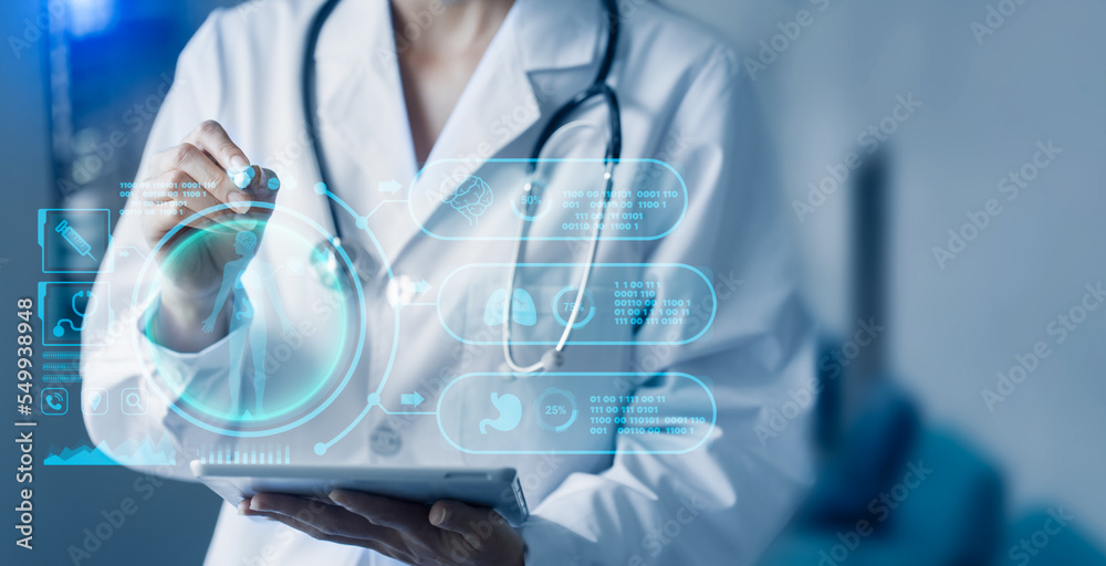 Medicine doctor using digital healthcare and network connection on hologram modern virtual screen interface icons, Medical technology futuristic concept.