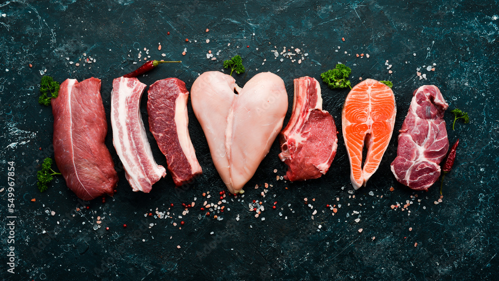 Raw food, set of steaks with salmon, veal, beef and chicken, on a dark stone background. Top view. Organic food.