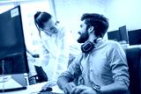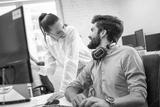Friendly customer support workers solving problems together on client's online account in call centre office.