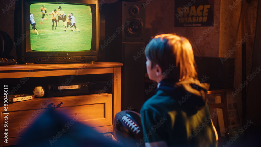 Young Sports Fan Watches American Football Match on TV at Home. Handsome Boy Supporting His Favorite Team. Holding a Football in Excitement. Nostalgic Retro Childhood Concept.