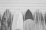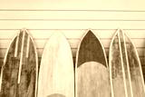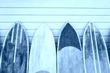 Several surfboards of different colorful saturated yellow, green, red colors lined up against the wall.