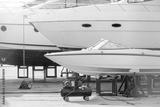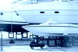 Stern nose of sea yachts and boats installed on special supports for storage and maintenance of ships in the docks.