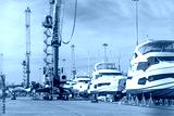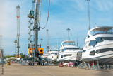 Sea port cargo cranes wheels supports for lifting marine vessels and offshore storage installations on land, servicing yachts, boats other ships in docks pier. Freight industry, maritime transport.