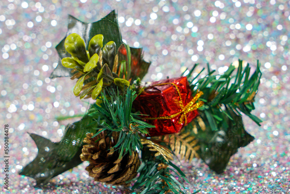 Christmas with red candles and christmas tree balls and fir branches and pine cones