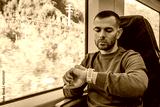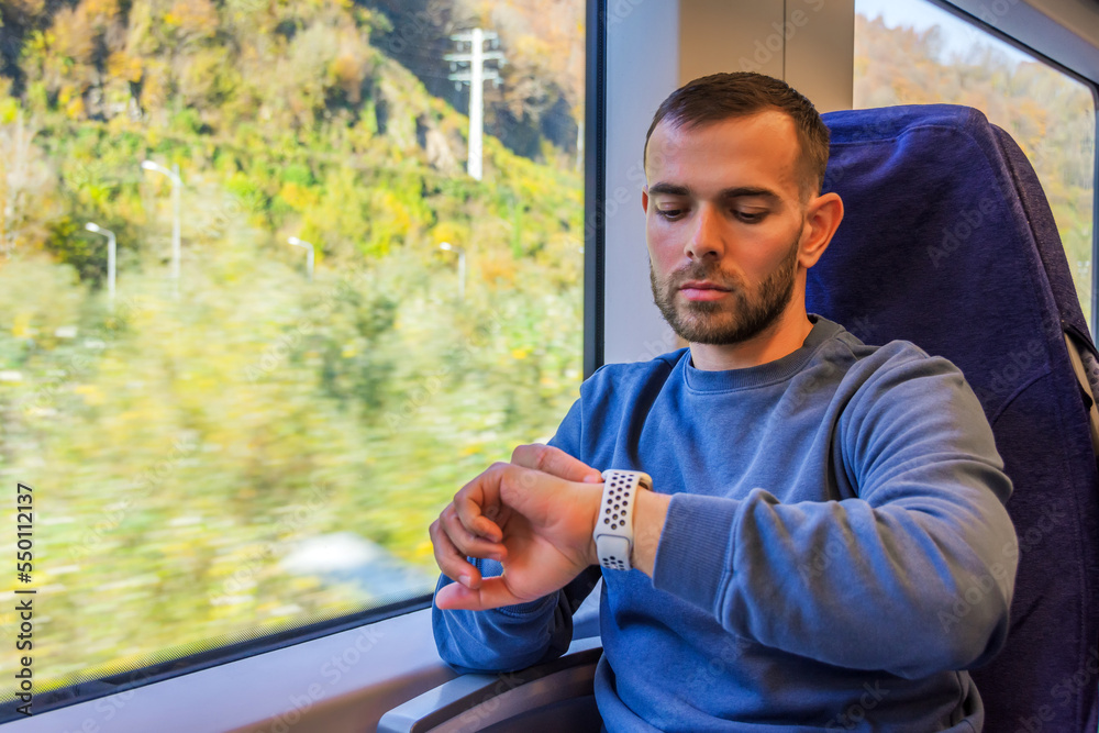 Middle-aged man looks at his watch to find out what time it is on the way, outside the window is a view of nature and a forest in a highland river valley.
