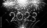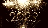 2023 New Year Celebration - Glitter On Golden Numbers With Sparkler And Fireworks In Black - Abstract Defocused Lights