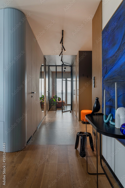 Interior design of harmonized hall with big blue painting, minimalistic blac consola, sculptures, candle in candlestick, wooden floor, modern stool and personal accessories. Home decor. Template.