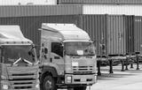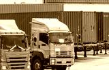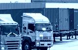 Logistic container with trailer truck. Cargo and shipping business. Container for truck transport. Container ship for import and export logistics. Logistic industry. Supply chain. Container freight.