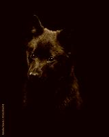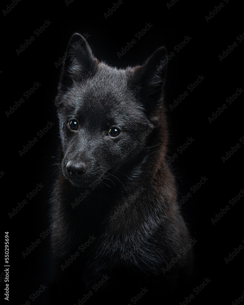 The head of a dog breed Schipperke on a black background