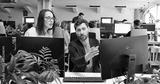 Caucasian male and female coworkers talking and discussing IT project at computer screen. Coworking space office. Man and woman developers chatting and having discussion. Startup communication.