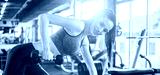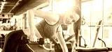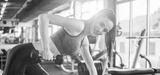 Young fit woman in sportswear working out with weights over fitness bench in gym. Attractive smiling girl working out in front of sunlight in the morning.
