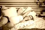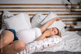 Beautiful pregnant woman relaxing in comfortable bed with pregnancy pillow