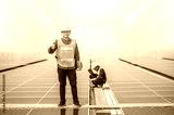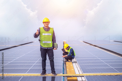 Confident Engineer standing check on Solar power energy at rooftop factory