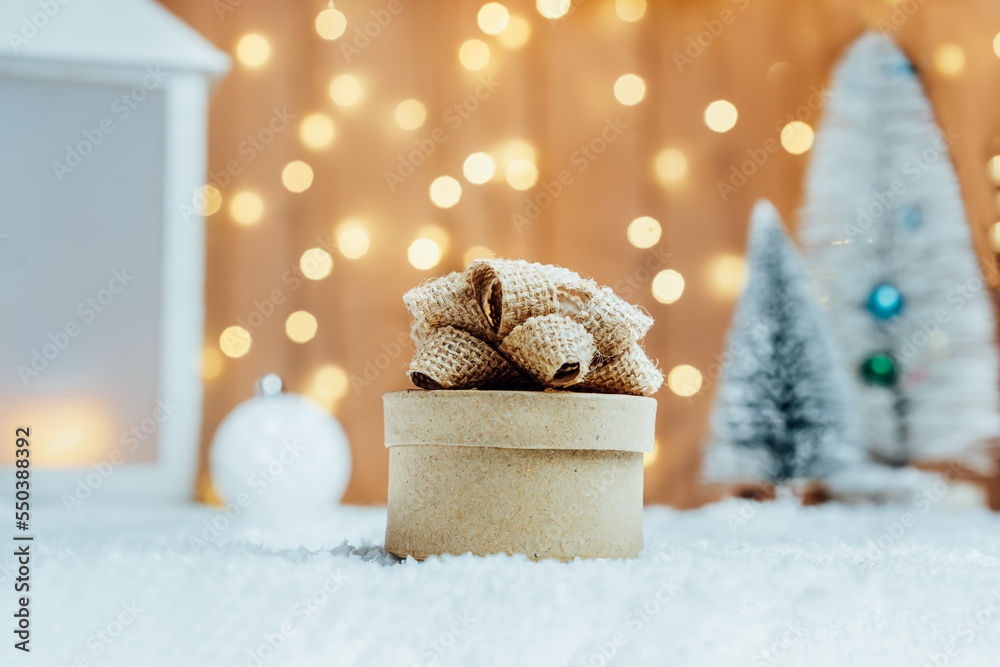 Christmas fairy tale composition of eco-friendly gift box on the snow with miniature Christmas trees, balls, lantern and warm lights bokeh background. Merry Xmas and Happy new year postcard.