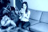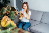 Young woman taking picture on phone of dried, sunburn leaf of potted plant Calathea. Houseplants diseases. Disorders Identification and Treatment search. Home gardening mobile app. Selective focus