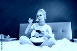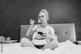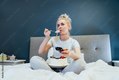 Surprised, stressed, shocked woman eating cake and holding a remote control while watching TV in bed. Scary horror movie or terrible news, scare in her eyes Overeating, Jamming of negative emotions