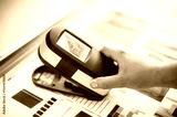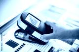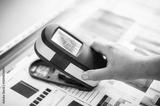 X-Rite handheld spectrophotometer verify color patches, modern press shop prepress department.