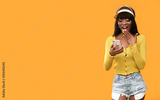 Beauty black skin female model is showing a positive emotions in photo studio on orange background.