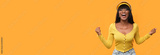 Beauty black skin female model is showing a positive emotions in photo studio on orange background.