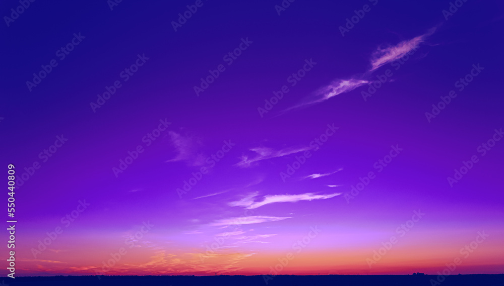 Bright Dramatic Sunset Sky In Violet Colours. Amazing Beautiful Sunset View With Magenta Sky. Very Peri. Bright Purple, Yellow Colors Of Sunrise Sky Background Gradient.