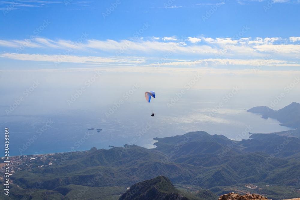 Paragliders flying from a top of Tahtali mountain near Kemer, Antalya Province in Turkey. Concept of active lifestyle and extreme sport adventure