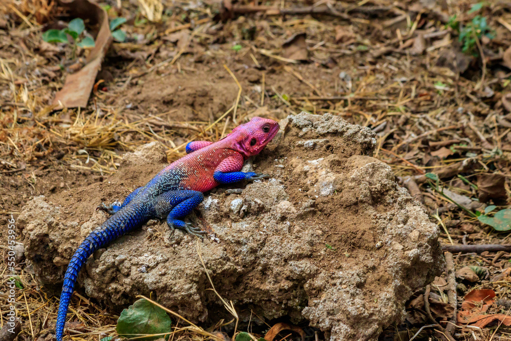 Male mwanza flat-headed rock agama (Agama mwanzae) or the Spider-Man agama on a stone in Serengeti National Park, Tanzania