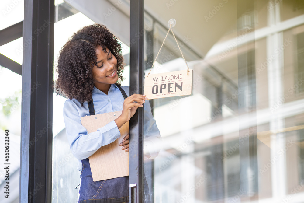 Happy waitress standing at restaurant entrance. Portrait of african american business woman attend new customers in her coffee shop. Happy woman owner showing open sign in her small business shop.