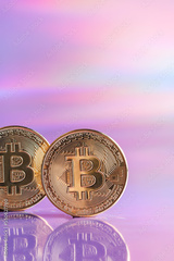 Golden bitcoin coins on holographic, abstract, neon background. digital currency, business style. Mining , trade bitcoin concept. selective focus