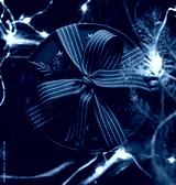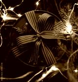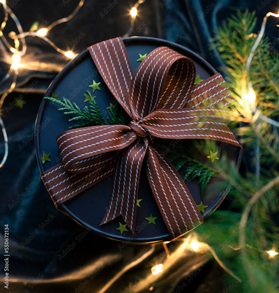 Christmas round gift box with ribbon concept composition on the velvet texture background. Close up