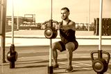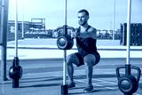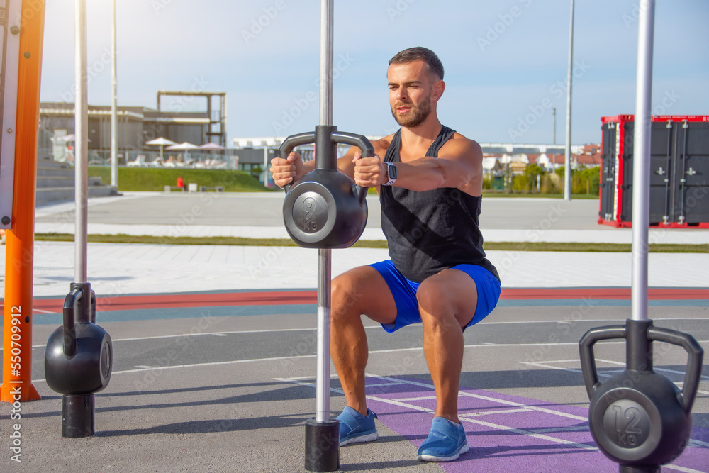 Caucasian young man does squats with lifting up heavy kettlebell on equipped sports ground in a city park. Heavy kettle workout in outdoor gym.