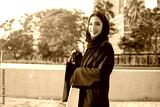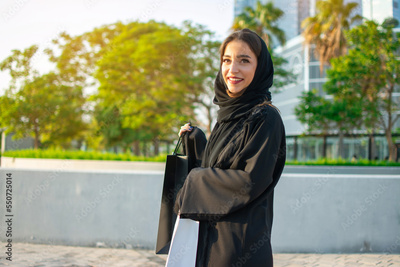 Young muslim woman enjoying shopping time in the city of Abu Dhabi. Beautiful Arabic woman with shopping bags on the street.
