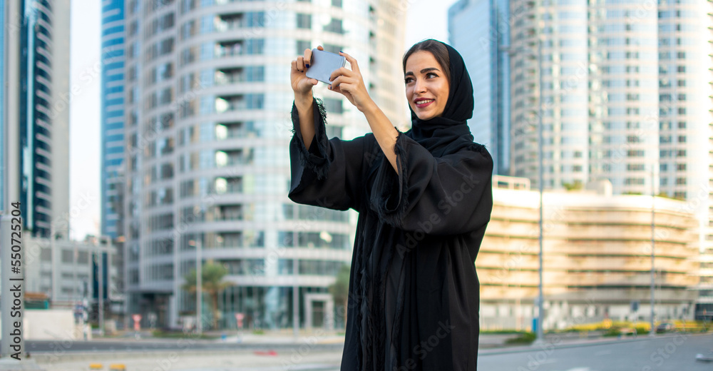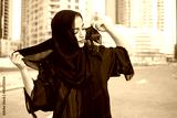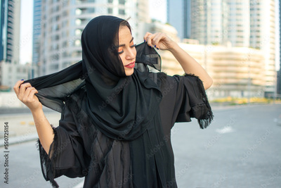 Portrait of beautiful middle eastern Arabian young woman wearing traditional arabic clothing. Arabian woman holding veil with hands.