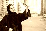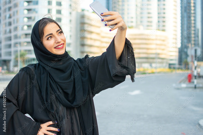 Young beautiful Arabian middle eastern woman taking selfie with mobile phone on the city street.