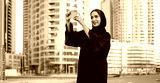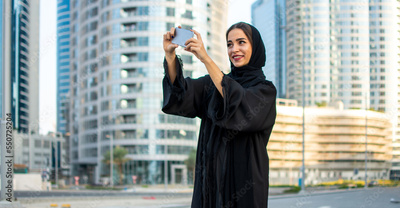 Young beautiful muslim middle eastern woman taking photo with mobile phone on the city street.