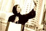 Beautiful muslim middle eastern woman taking photo with mobile phone on the city street.