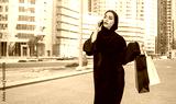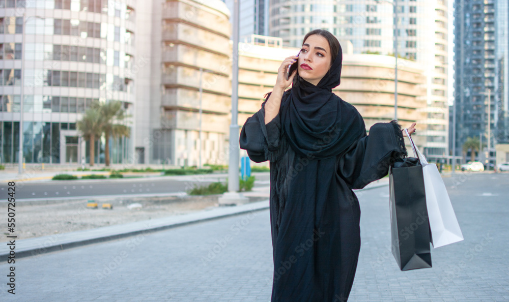 Serious Arab woman in traditional wear holding shopping bags in hands and talking on mobile phone while walking on the city street