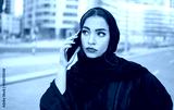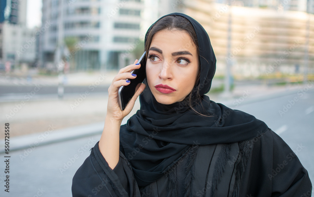 Young beautiful Arab businesswoman wearing Abaya talking on smart phone on the street.