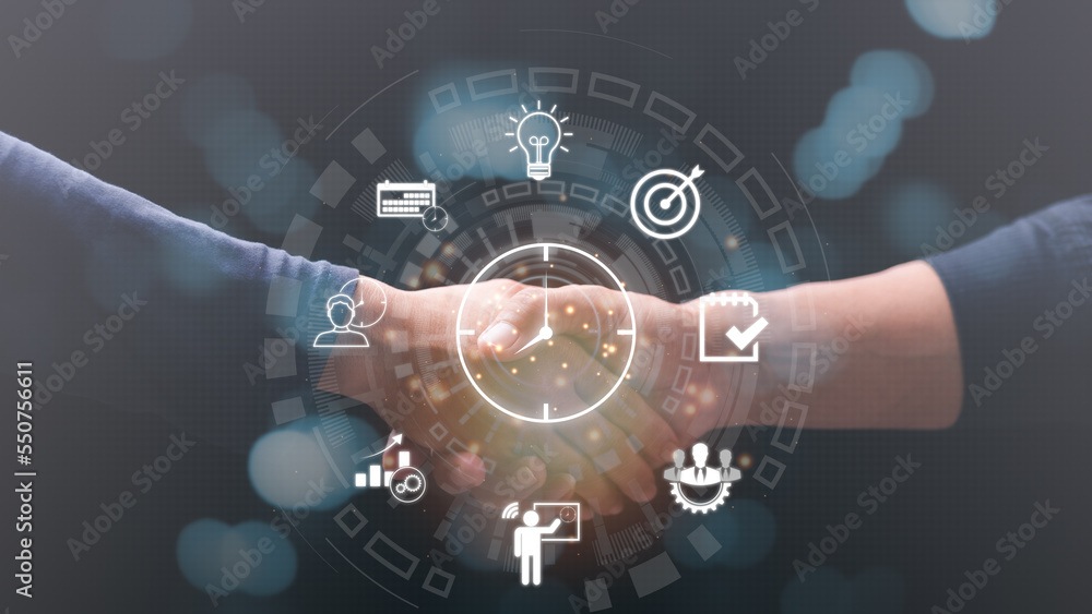 Two businessmen shaking hands, time management concept,effective business planning,time management in the organization,Agreement and solution,