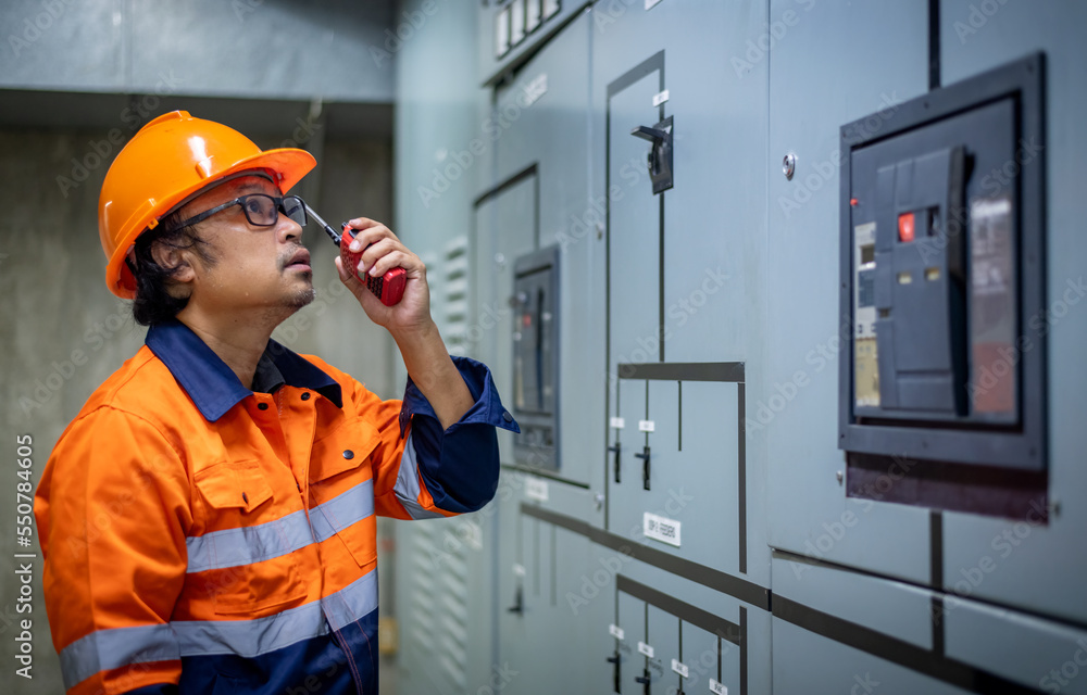 The engineer checking and inspecting at MDB panel .he working with electric switchboard to check range of voltage working in Main Distribution Boards factory.
