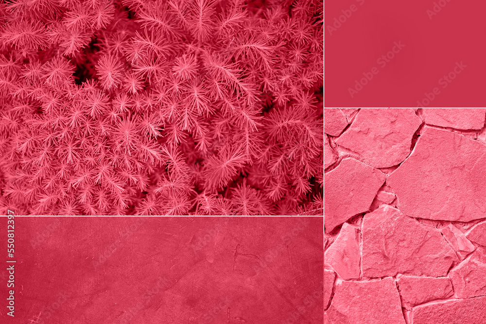 Color of the year 2023 background, viva magenta red colour with a copy space, collage with four textures.