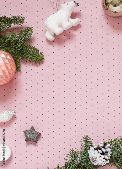 Christmas or New Year holiday concept frame on the polka dot pattern pink background. Copy space
