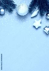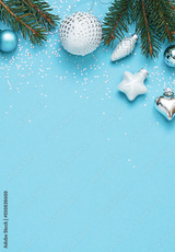 Christmas holiday concept frame with festive decoration on the blue background. Copy space