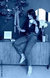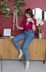 Happy young woman holding a mobile phone and a cup of coffee in hand in the room with Christmas holiday decoration. Girl scrolling social media content concept