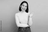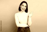 Portrait of adorable friendly woman with brown hair standing waving hand