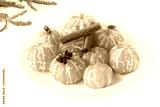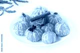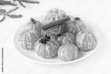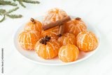 Macro shot of peeled juicy tangerines decorated with star anise spice and cinnamon sticks on the white plate isolated on white. Winter holidays atmosphere. Merry Christmas and Happy New Year