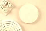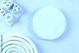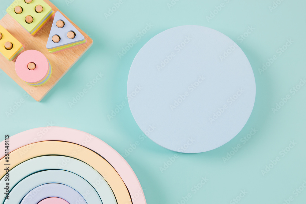 Empty round platform podium stand and natural wooden ecological sustainable zero waste educational toys on light blue background. Montessori, eco-friendly toys for children. Top view, flat lay